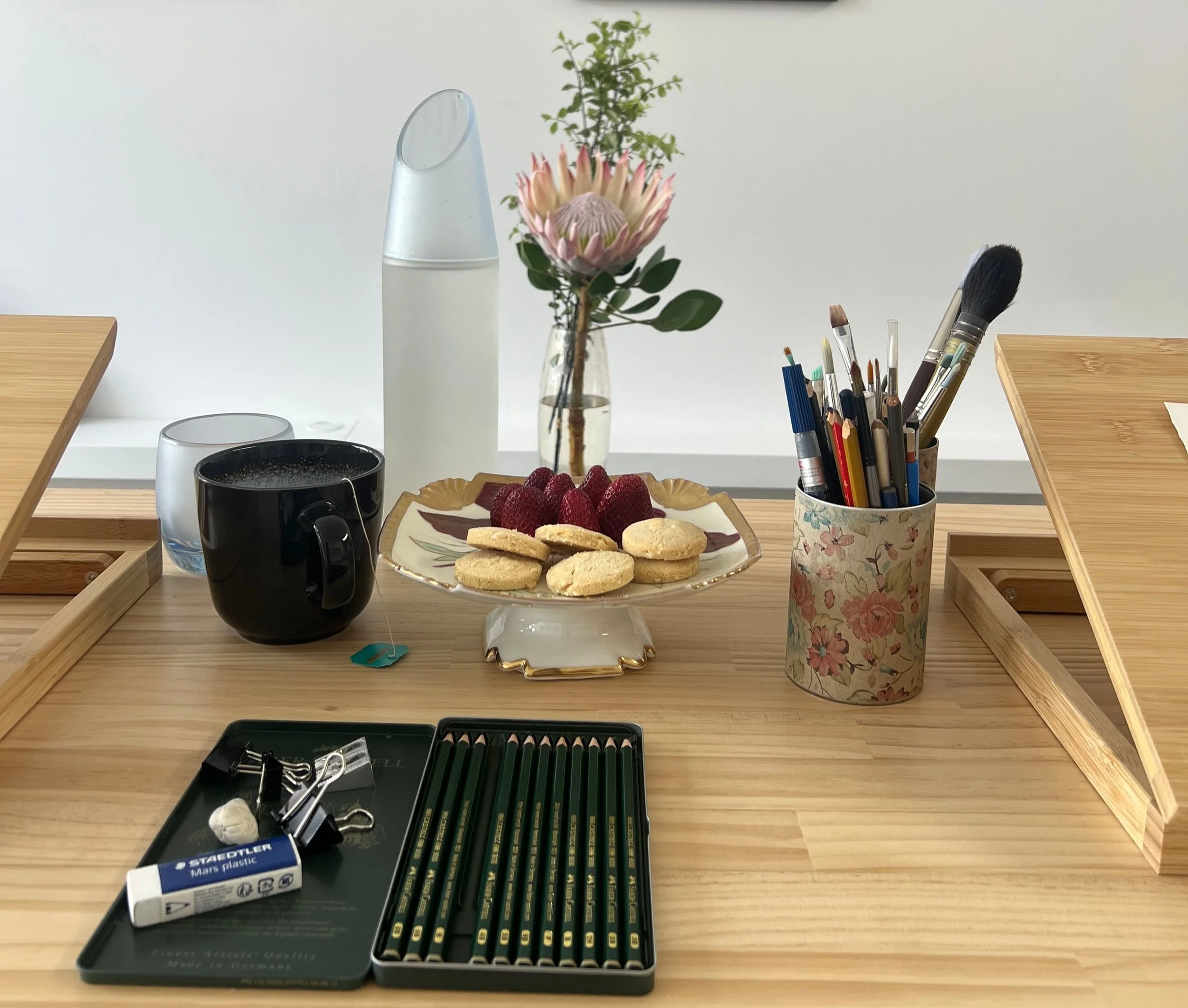 Art practice sessions where you can draw and paint alongside friends, hobbyists and local artists. Topics include floral still-life, portraiture and life drawing.